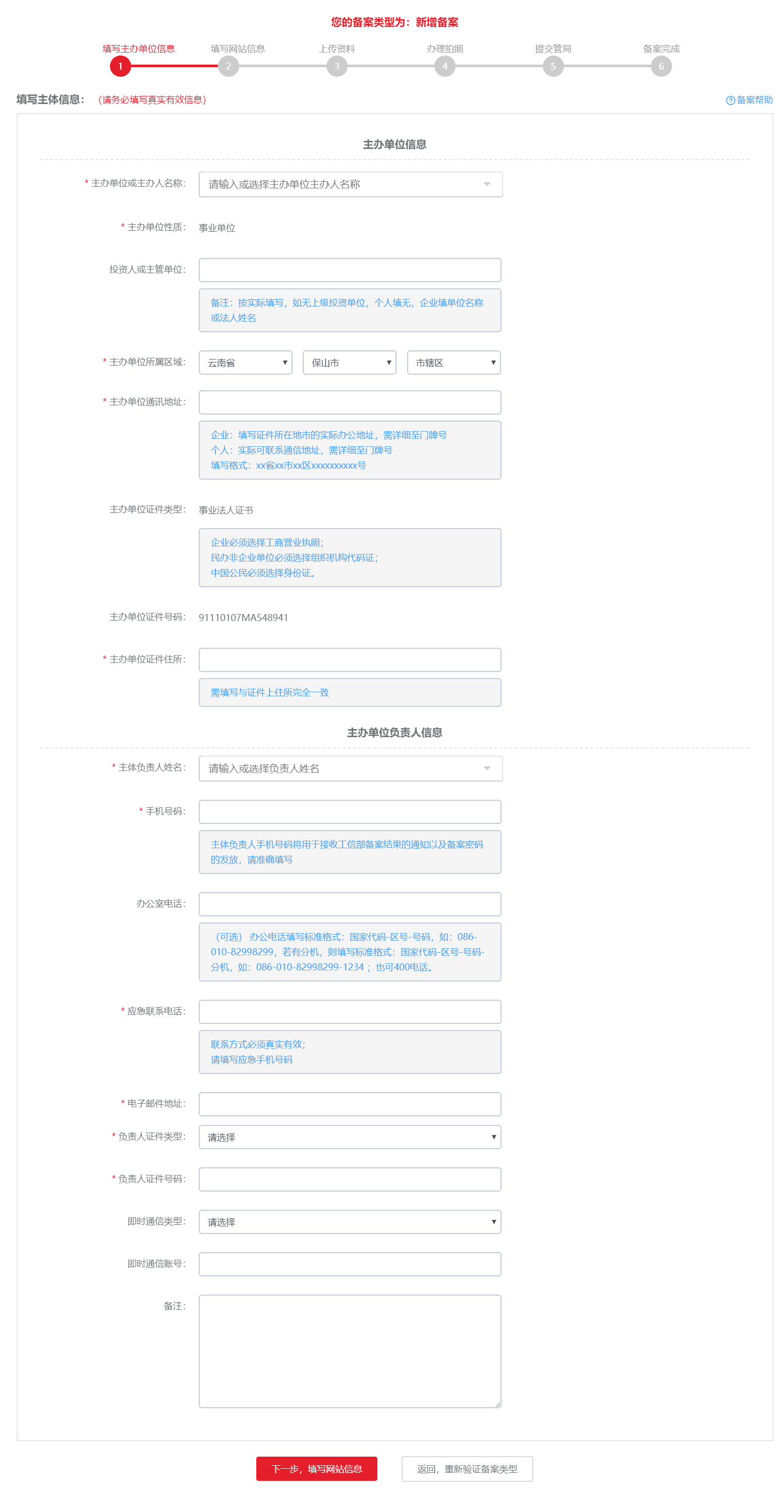 按提示填写本次备案的主体信息,填写完成点击“ 下一步,填写网站信息 ” ;(如需重新验证备案类型,可点击“ 返回,重新验证备案类型 ”)