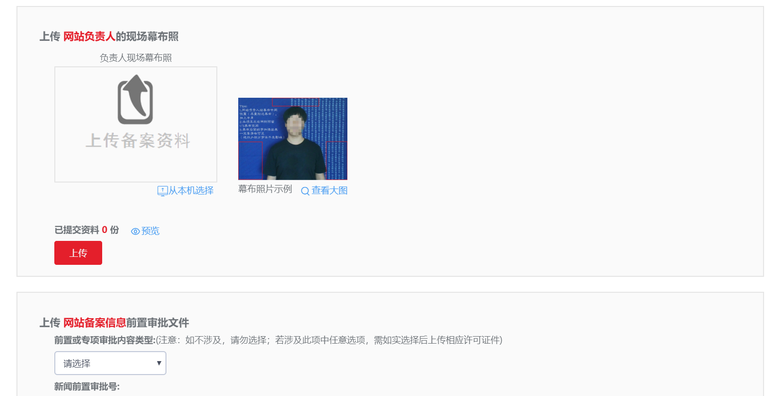 幕布照拍好后请进入“查看备案信息”页面,点击“上传网站证件”---上传幕布照片