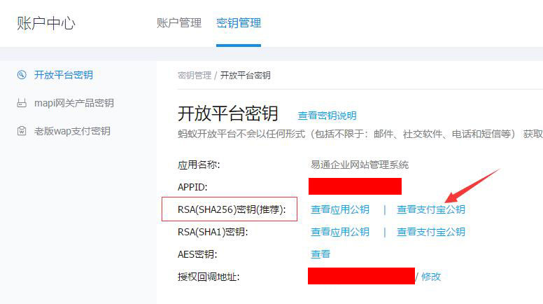 然后点击 [ 开放平台密匙 ] ,点击后左侧 [ 查看支付宝公匙 ] 。